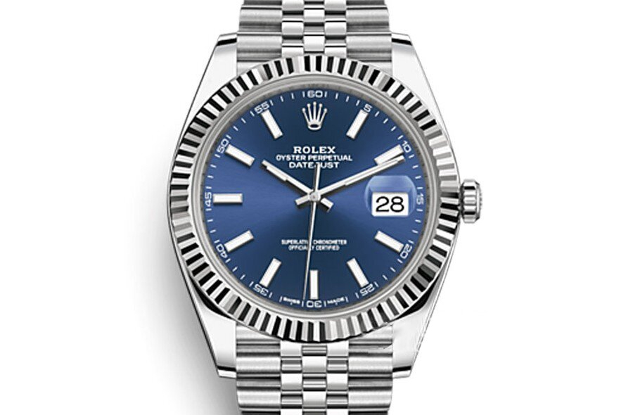 Diese Oyster Perpetual Datejust 41 in Oystersteel verfügt über ein hellblaues Zifferblatt und ein Jubilee-Armband.