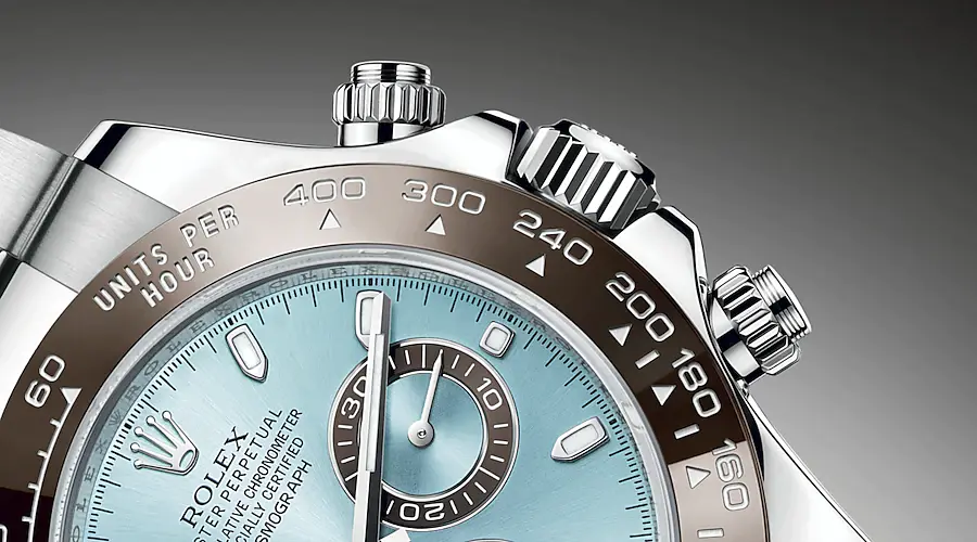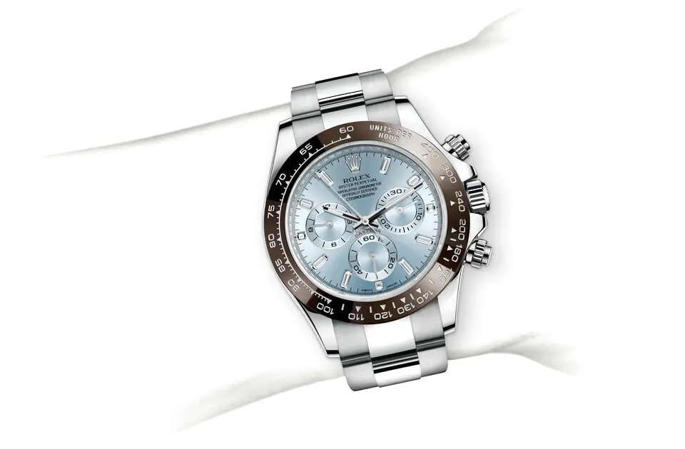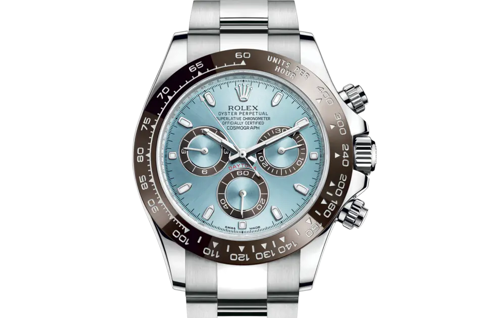 Diese Oyster Perpetual Cosmograph Daytona in Platin mit eisblauem Zifferblatt und Oyster-Armband verfügt über eine kastanienbraune Cerachrom-Lünette mit Tachymeterskala.