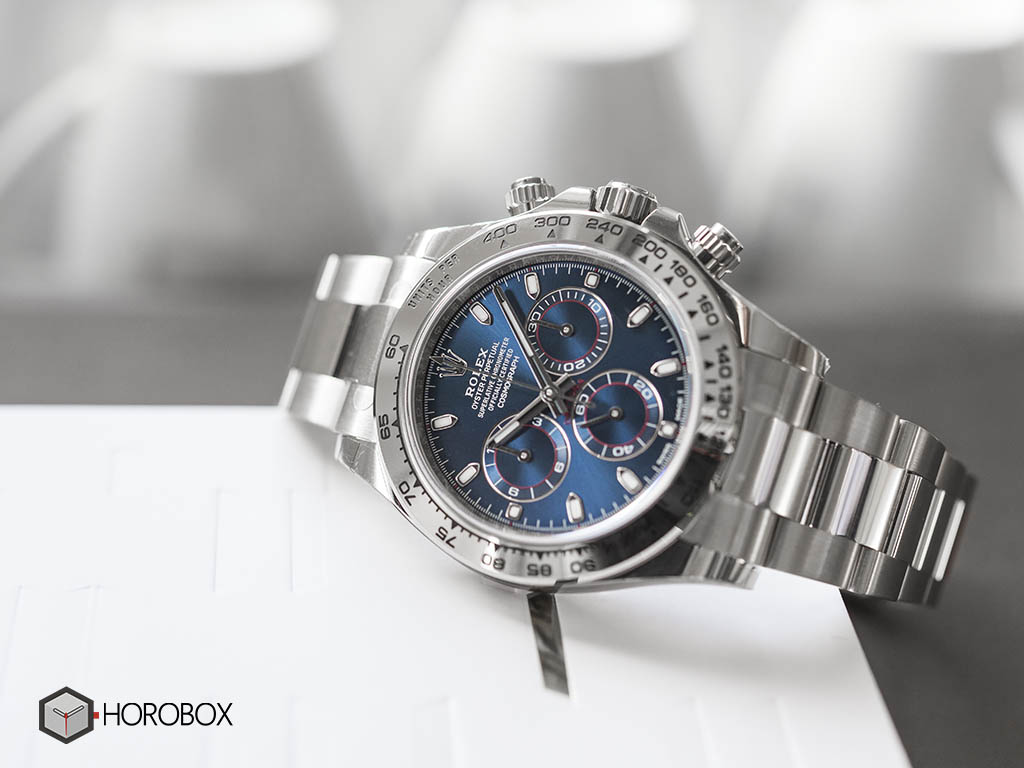 Dieses Modell verfügt über ein hellblaues Zifferblatt mit schneckenförmigen Zählern, applizierten Indexen aus 18 Karat Gold und Zeigern mit einer Chromalight-Anzeige, einem gut lesbaren Leuchtmaterial. Der zentrale Zentralsekundenzeiger ermöglicht ein genaues Ablesen von 1/8 Sekunden, während die beiden Zähler auf dem Zifferblatt die verstrichene Zeit in Stunden und Minuten anzeigen. Fahrer können ihre Streckenzeiten und Taktiken ohne Fehler genau abbilden.