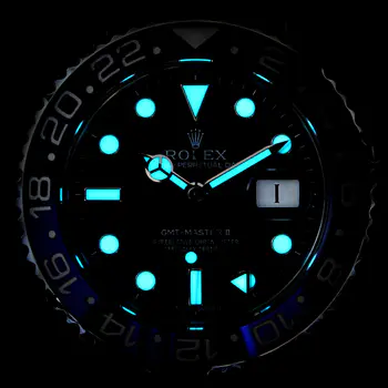 Rolex GMT-Master II Swiss Replica Uhren sind mit dem neuen SuperLuminova™ Blue Glow Leuchtpigment ausgestattet, das nach ausreichender Aktivierung durch Sonnen- oder Kunstlicht im Dunkeln bis zu 9 Stunden lang durchgehend mit gleichmäßiger Leuchtkraft leuchtet.