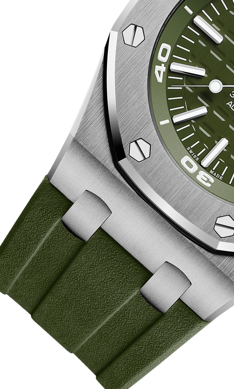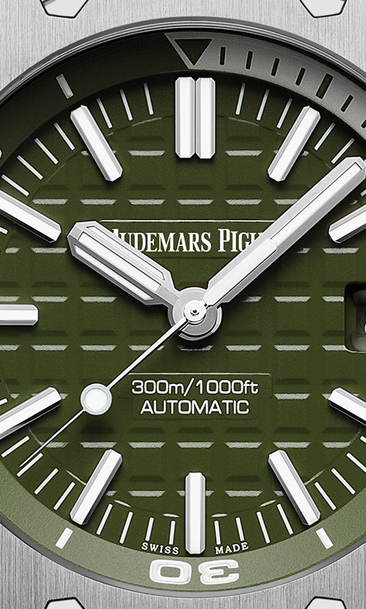 DIAL: Khaki dial with “Méga Tapisserie” pattern, white gold applied hour-markers and Royal Oak hands with luminescent coating, khaki rotating inner bezel with zone from 60 to 15 minutes in white