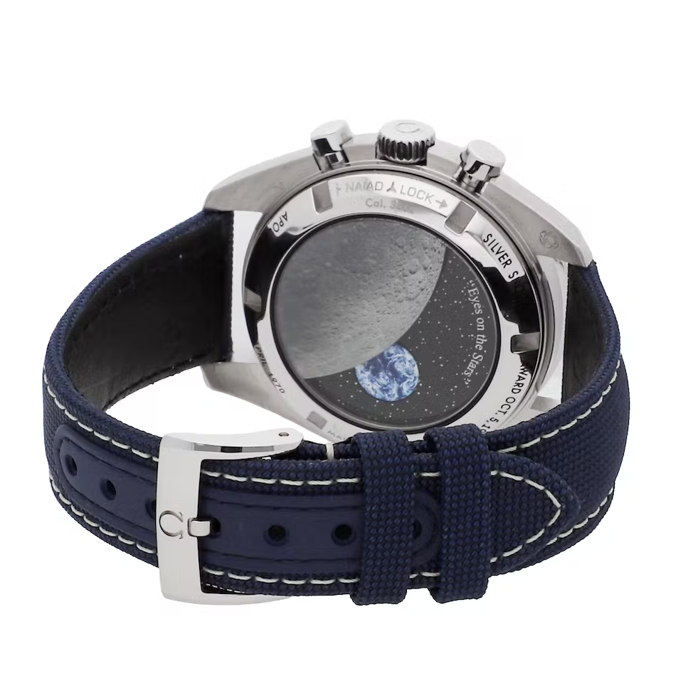 OMEGA Speedmaster Chronograph Anniversary "Snoopy Silver Award" (31032425002001) manual winding watch with a 42mm stainless steel case, blue ceramic bezel surrounding a silver dial and blue fabric strap with stainless steel buckle. Functions include hours, minutes, small seconds, chronograph, and tachymeter
