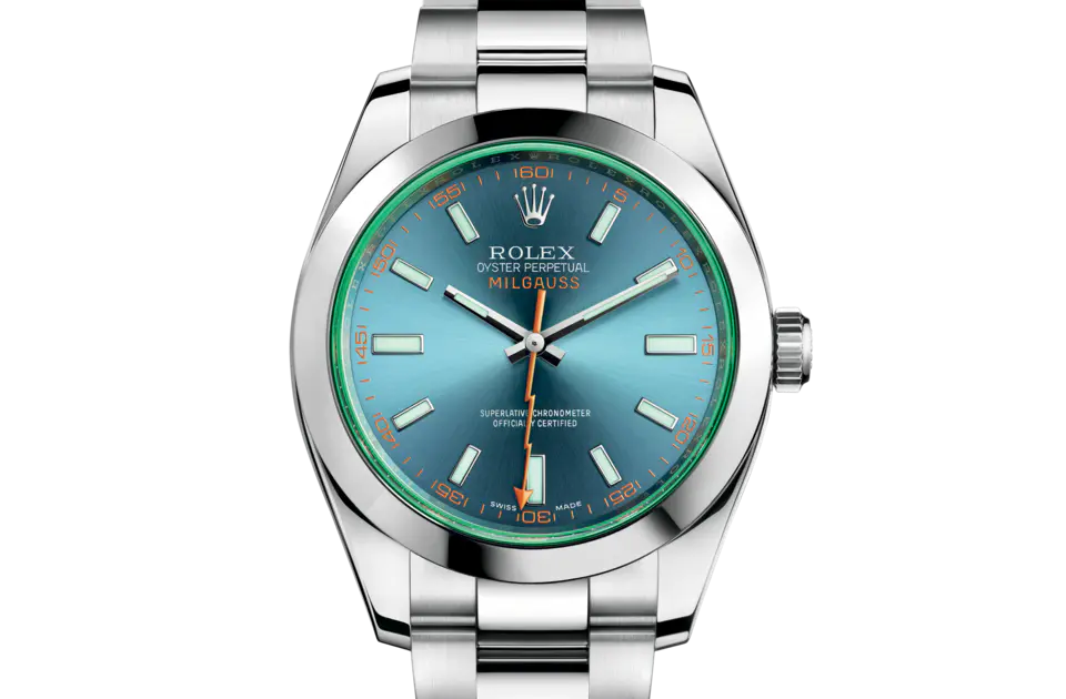 Das grüne Saphirglas ist ein einzigartiges, von entwickeltes Uhrenglas, es ist kratzfest, lichtbeständig und exklusiv bei der Milgauss erhältlich.