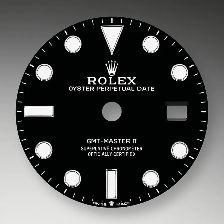 Zusätzlich zu den herkömmlichen Stunden-, Minuten- und Sekundenzeigern verfügt die GMT-Master II über einen Zeiger mit Pfeilspitze, der das Zifferblatt alle 24 Stunden einmal umkreist, sowie über eine in beide Richtungen drehbare Lünette mit 24-Stunden-Graduierung.
