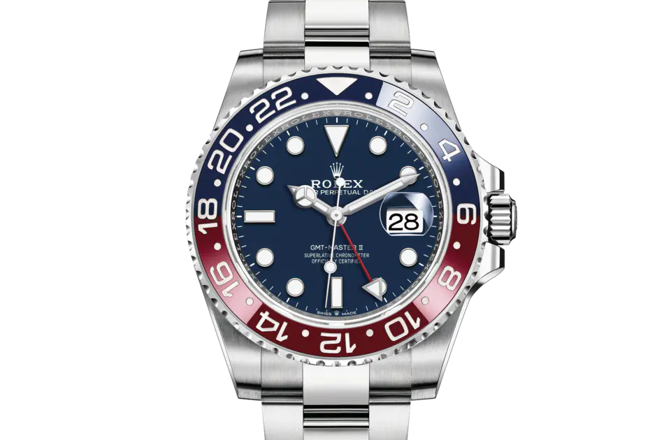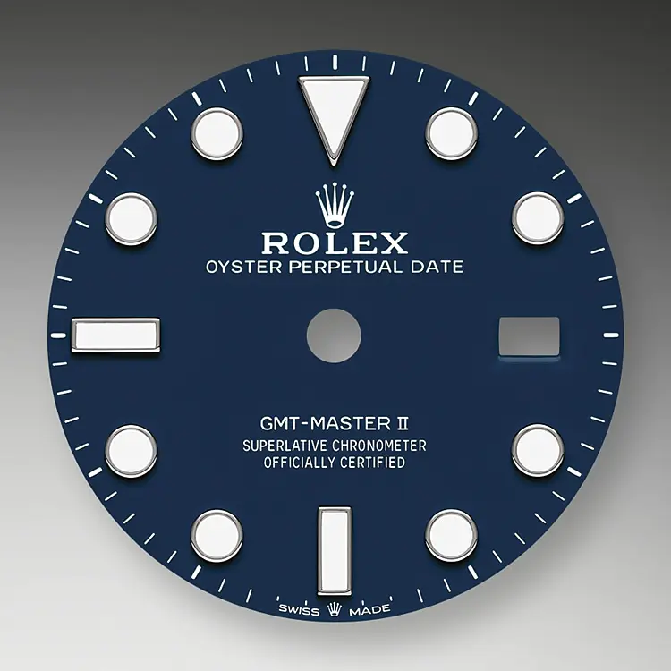 Zusätzlich zu den herkömmlichen Stunden-, Minuten- und Sekundenzeigern verfügt die GMT-Master II über einen Zeiger mit Pfeilspitze, der das Zifferblatt alle 24 Stunden einmal umkreist, sowie über eine in beide Richtungen drehbare Lünette mit 24-Stunden-Graduierung.