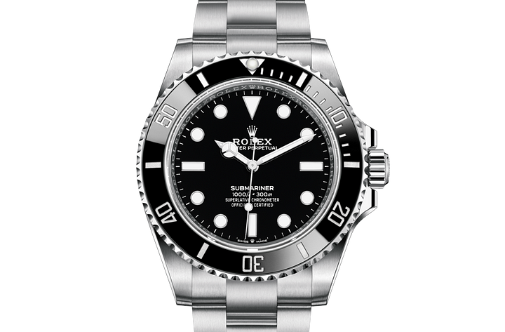 Die Oyster Perpetual Submariner in Edelstahl Oystersteel mit einem Cerachrom-Lünetteneinsatz aus schwarzer Keramik und einem schwarzen Zifferblatt mit großen Leuchtindizes.