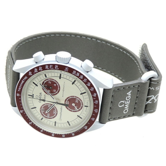 On this watch, light cool grey tones contrast with the dark grey VELCRO© strap. The chronograph seconds hand and subdial hands are black, while the counters and bezel background are in two burgundy tones. All dials carry the OMEGA X SWATCH branding, as well as the iconic Speedmaster logo and the new MoonSwatch logo. The glass construction, the “hidden” S integrated in the center of the crystal, the fine and sophisticated circular pattern on the dial outer ring and the subdials, the sharp and smooth lugs construction, the iconic “dot over 90” detail on the tachymeter scaled bezel, and of course the unique Bioceramic touch are common to all models and stand for passionate love for details. SO33M101