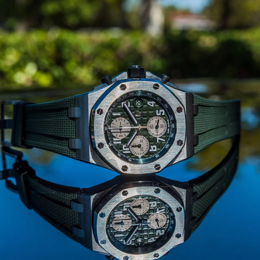 DIAL: Khaki green dial with “Mega Tapisserie” pattern, silver-toned counters, arabic numerals hour-markers and white gold Royal Oak hands with luminescent coating, khaki green inner bezel.