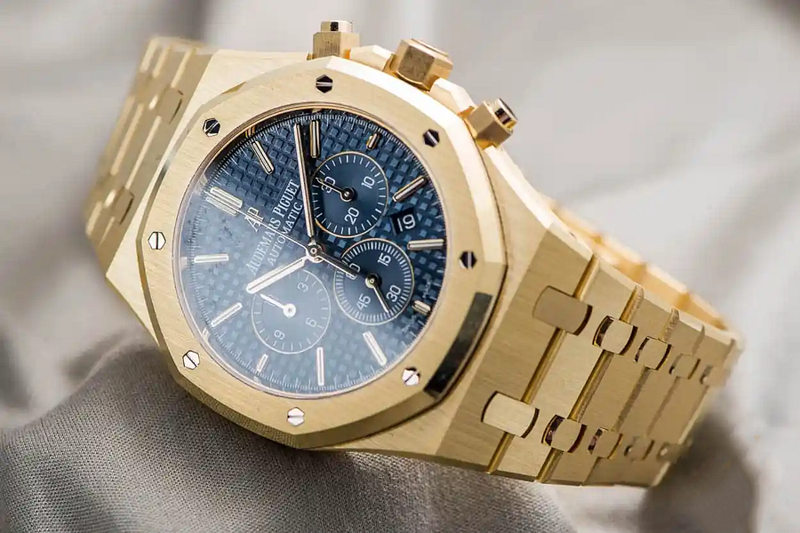 DIAL : Blue dial with “Grande Tapisserie” pattern, Blue counters, yellow gold applied hour-markers and Royal Oak hands with luminescent coating